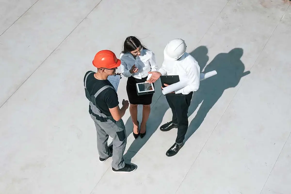a group of construction engineers discussing project on a tablet